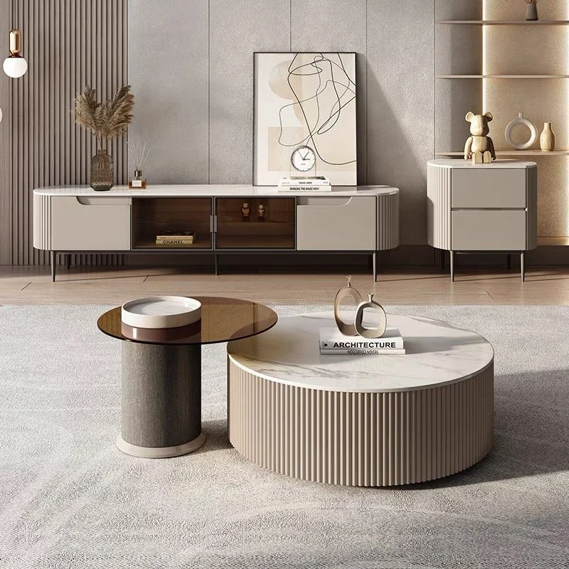 This coffee table set perfectly integrates the deep wood color with the vivid marble patterns. The round shape fully demonstrates a soft and beautiful aesthetic. The natural veins of the marble are like the surging sea of clouds, setting off against the simple wood, painting an elegant and highly tasteful living picture in the space.