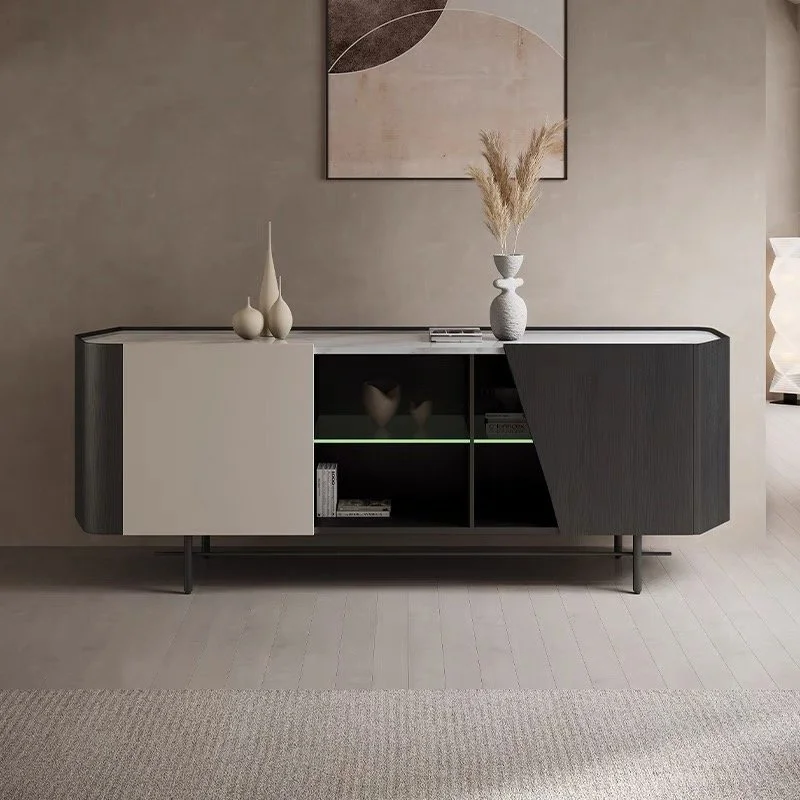 This side cabinet features a combination of black, white, and gray colors. Its unique geometric shape design is highly modern. The marble countertop adds a sense of texture. The open glass compartments with built - in lights not only facilitate the display of items but also create a warm atmosphere. Whether placed in the living room or bedroom, it can become a highlight in the space.