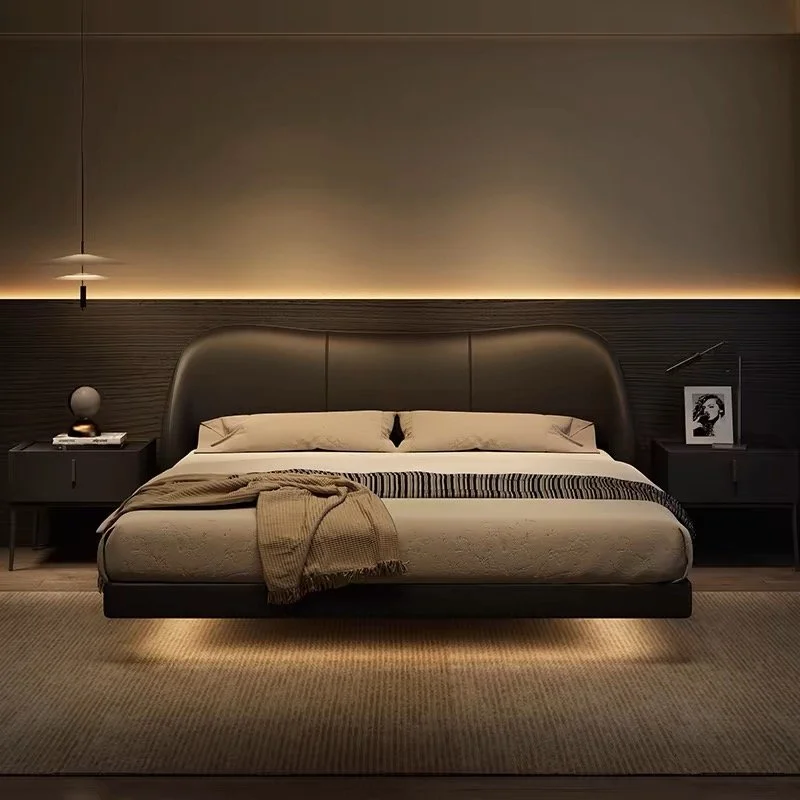 This bed features a headboard crafted from dark - toned leather. The unique curved shape is elegant and grand, exuding a luxurious feel. Paired with light beige bedding, it creates a harmonious color contrast. The hidden lighting design under the bed creates a quiet and warm atmosphere at night, bringing you a comfortable sleeping experience.