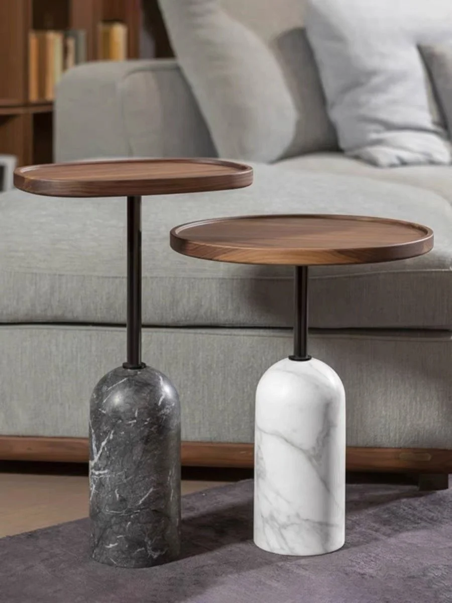 This set of side tables uses black and white marble as the base, with unique and natural textures. Paired with warm walnut tabletops and connected by thin metal rods, they show exquisiteness within simplicity. They bring an atmosphere where modern fashion and elegance coexist to spaces like the living room.