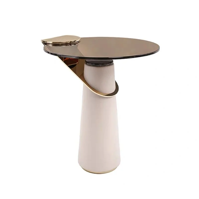 This side table features a transparent brown glass tabletop with a unique texture, paired with a white conical base. The golden trim on the base adds a touch of delicacy and fashion. The layered design of the tabletop increases its vibe. Whether placing tea sets or decorative ornaments, it can add a lively charm to the space.